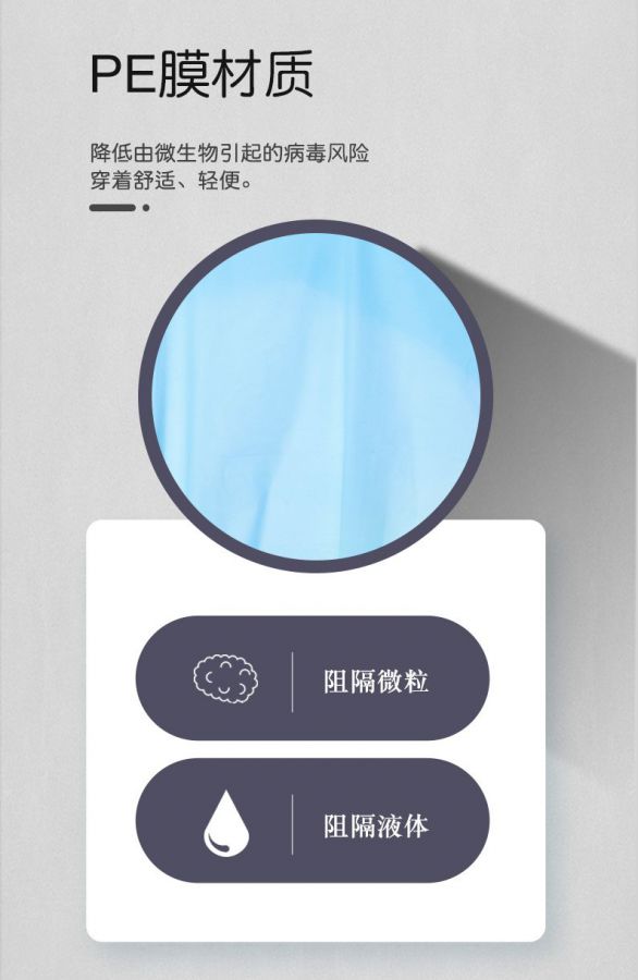 產(chǎn)品性能:長袖,大拇指袖口、降低由微生物引起的病毒風(fēng)險(xiǎn)、穿著舒適,輕便,防水。